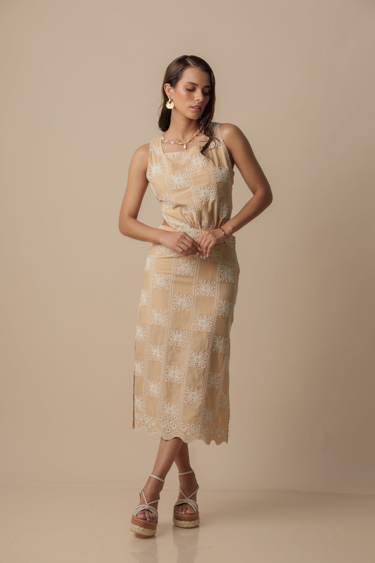 Vestido midi confeccionado en broderie 100% algodón con un forro interno de nansú algodón. Lleva un sutil cut out en la cintura que afina la silueta. La falda lleva cierre invisible y  aberturas laterales que estilizan el movimiento. En la espalda se ajusta en un escote gota con botón forrado y un cut out elasticado. Perfecto para un outfit atemporal y elegante.
